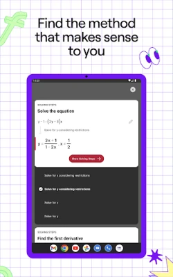 Scan any math problem with the Photomath app to get step-by-step explanations with accurate solutions and a variety of teacher-approved methods. Math is about the process, so Photomath breaks your problem into bite-sized steps to help you understand the “what” and “why” along with the “how.” Whether you’re learning basic arithmetic or advanced geometry, we’ll tackle it together, step by step.